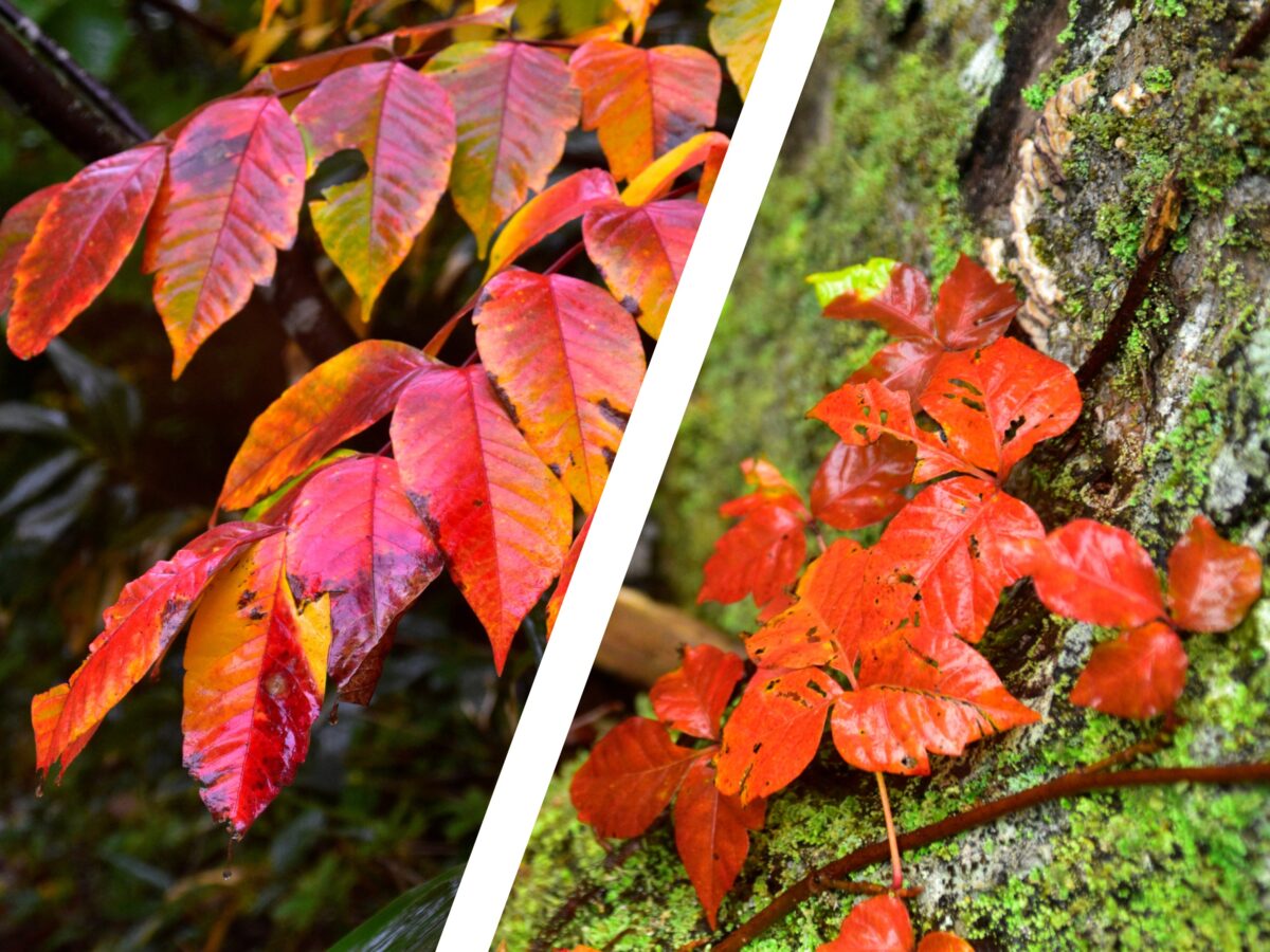 いち早く紅葉した姿を見せるウルシの葉。その紅葉の美しさから「麗(うるわ)しの木」が転じてウルシと呼ばれるようになったという説もあるようです。そんなウルシですが、尾瀬の森の中では2種類のウルシが見られます。高さ3m程の低木のヤマウルシとその名のとおりツタ状のツタウルシがありますが、それぞれ葉の付き方も特徴的です。ヤマウルシは鳥の羽のように葉が並んでいることから「羽状複葉」と呼ばれる葉の形態を持ち、ツタウルシの葉は3枚セットで見られるので「三出複葉」と呼ばれる葉の形態を持ちます。その他、中国原産の漆器や塗料の原料となるいわゆる「ウルシ」は日本中の森の中に野生化したものが生育しています。どのウルシもかぶれの原因となる「ウルシオール」を含みますので手を触れぬようお気をつけください。