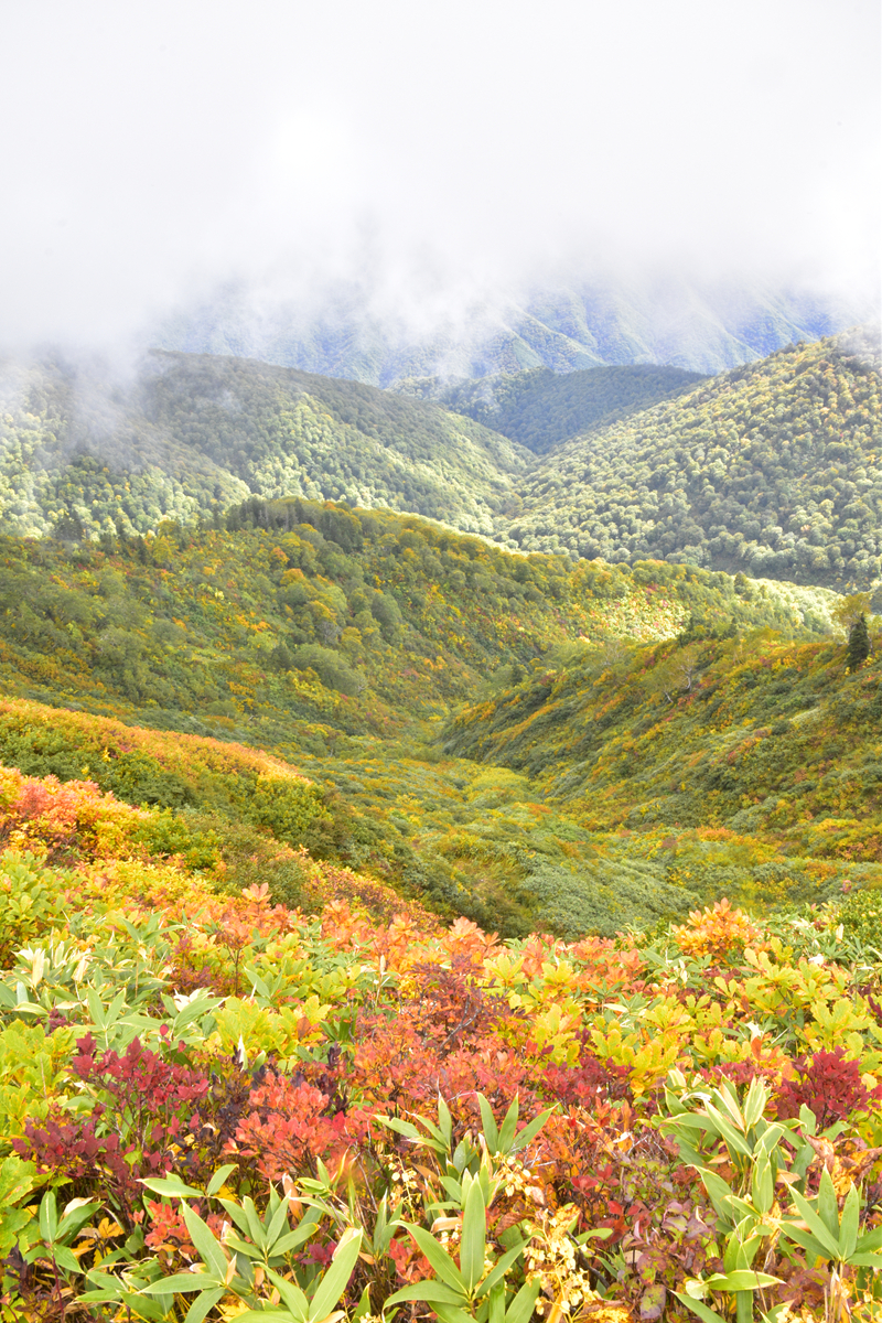 キリンテからの登山道の山麓では青々としたブナの森が広がっていますが、標高1500m付近からは少しずつ色づくカエデの姿が見られるようになりました。