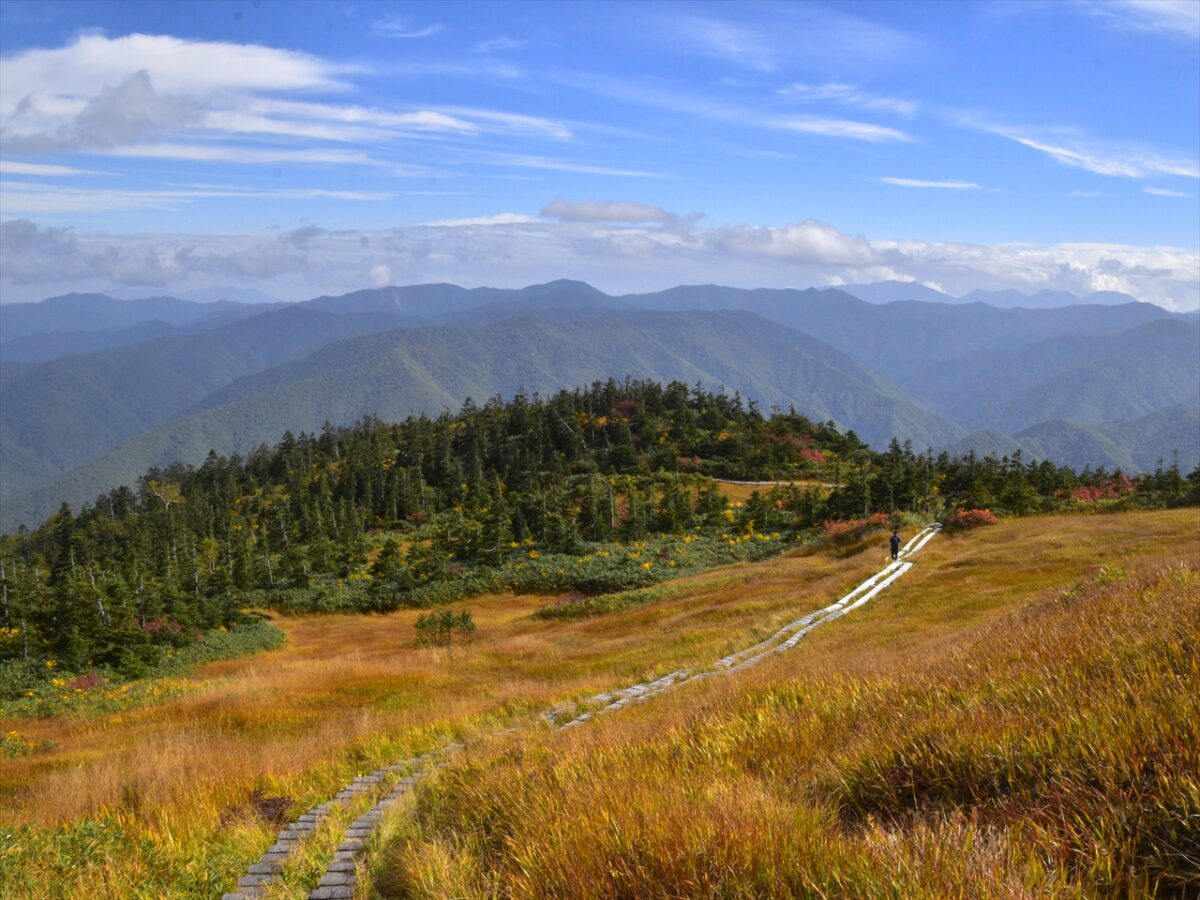 稜線の草紅葉は今がまさに見頃です。富士見林道の木道は細い箇所が多いです。すれ違いの際、湿原に下りないよう、登山道を引き返してすれ違いをするなど、自然への配慮を心掛けた登山をお願いします。また、草紅葉の湿原の地中では高山植物たちが静かに根を休めています。くれぐれもストックで湿原を突くことのないようご協力願います。