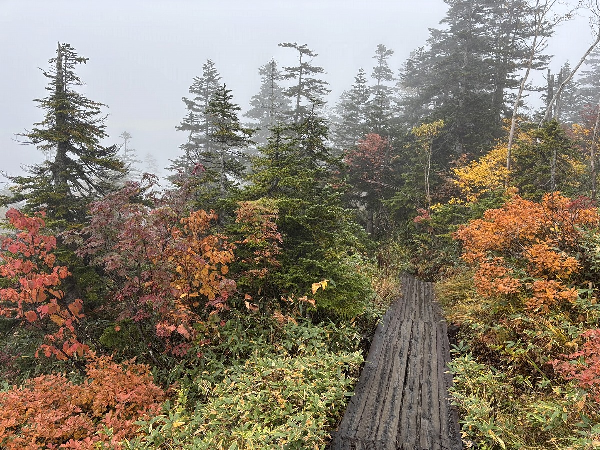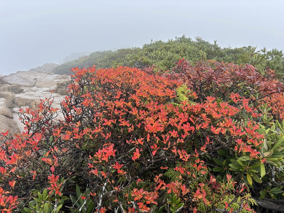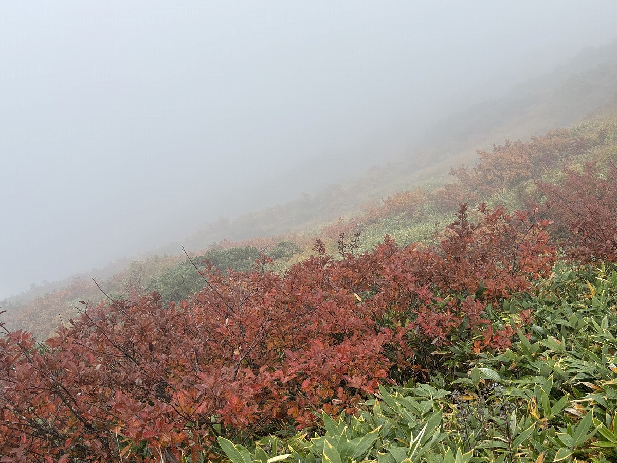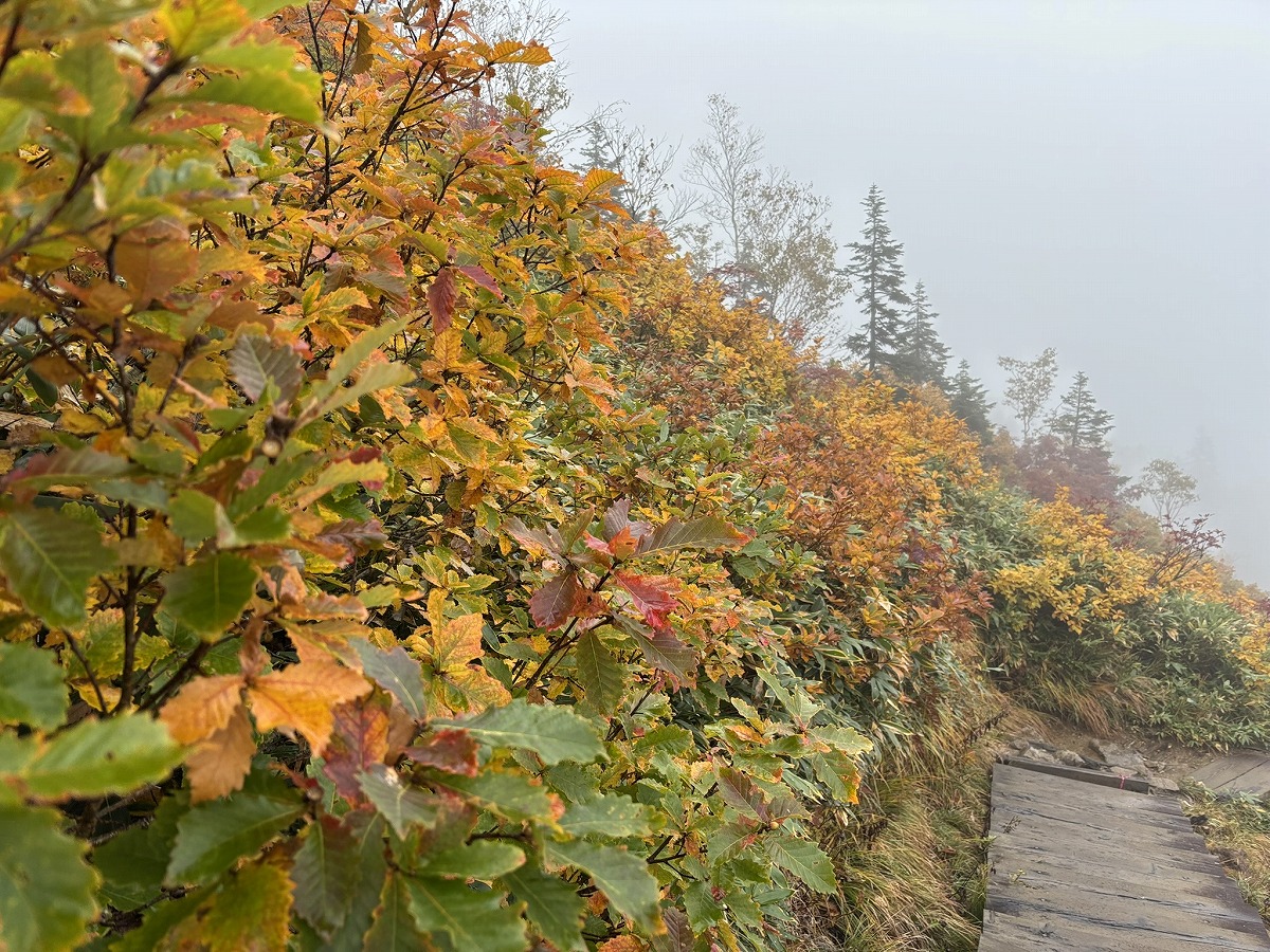 霧雨が止んでからも遠くの景色も青空も望めない一日でしたが、登山道近くの紅葉を楽しむことができました。とはいえ、濡れた蛇紋岩や木道は大変滑りやすいです。特に下りは、慎重に足場を選んで歩いてください。また、風があると体感気温がぐっと下がります。レインウェアや防寒着は必ずご用意ください。