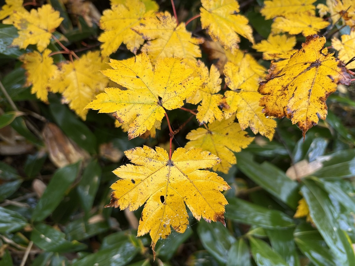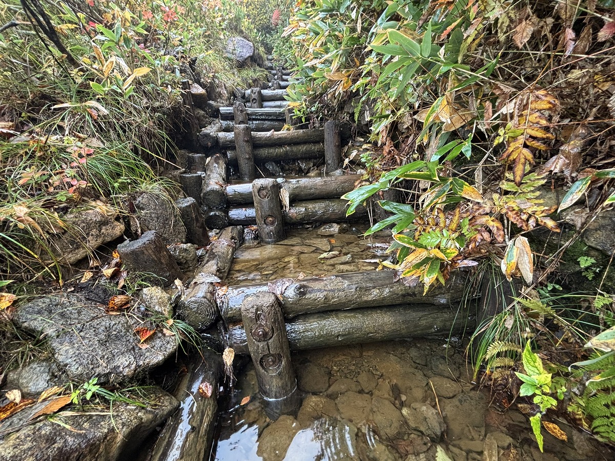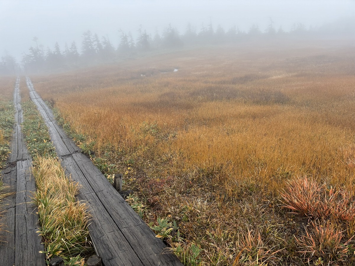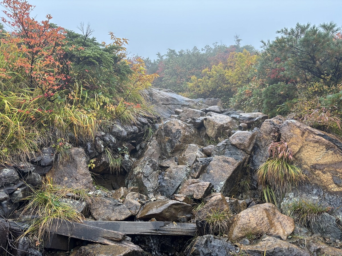 霧雨が止んでからも遠くの景色も青空も望めない一日でしたが、登山道近くの紅葉を楽しむことができました。とはいえ、濡れた蛇紋岩や木道は大変滑りやすいです。特に下りは、慎重に足場を選んで歩いてください。また、風があると体感気温がぐっと下がります。レインウェアや防寒着は必ずご用意ください。
