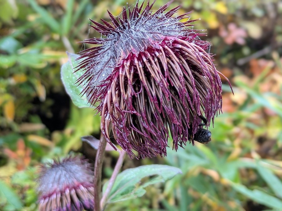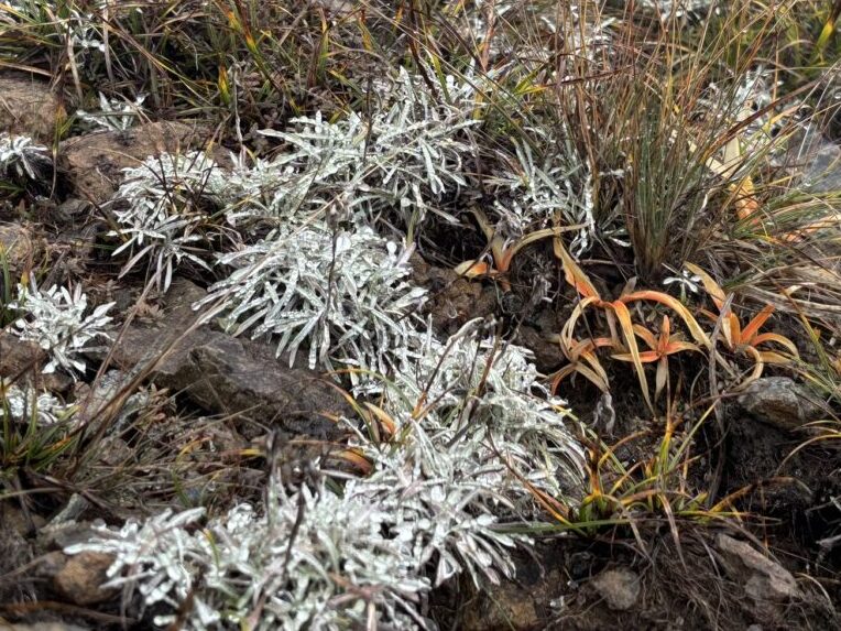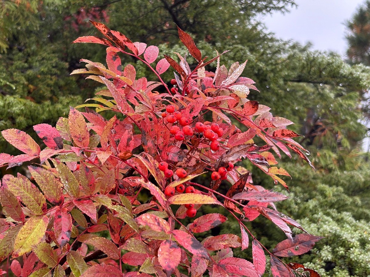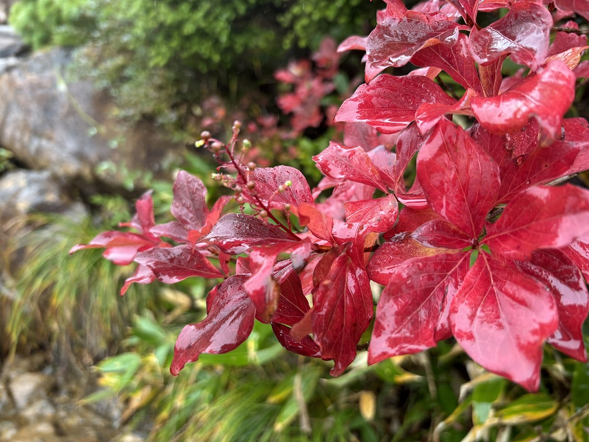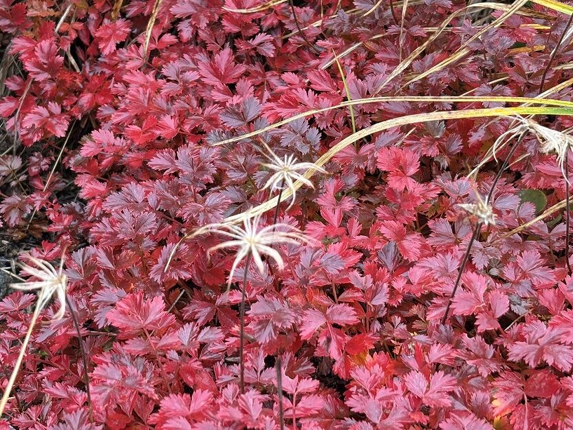 白銀の葉に見えたのは、霧粒をまとったホソバヒナウスユキソウです。赤や黄色に色づいた植物たちもしっとりと濡れて、瑞々しく見えました。霧雨ならではの出会いですね。