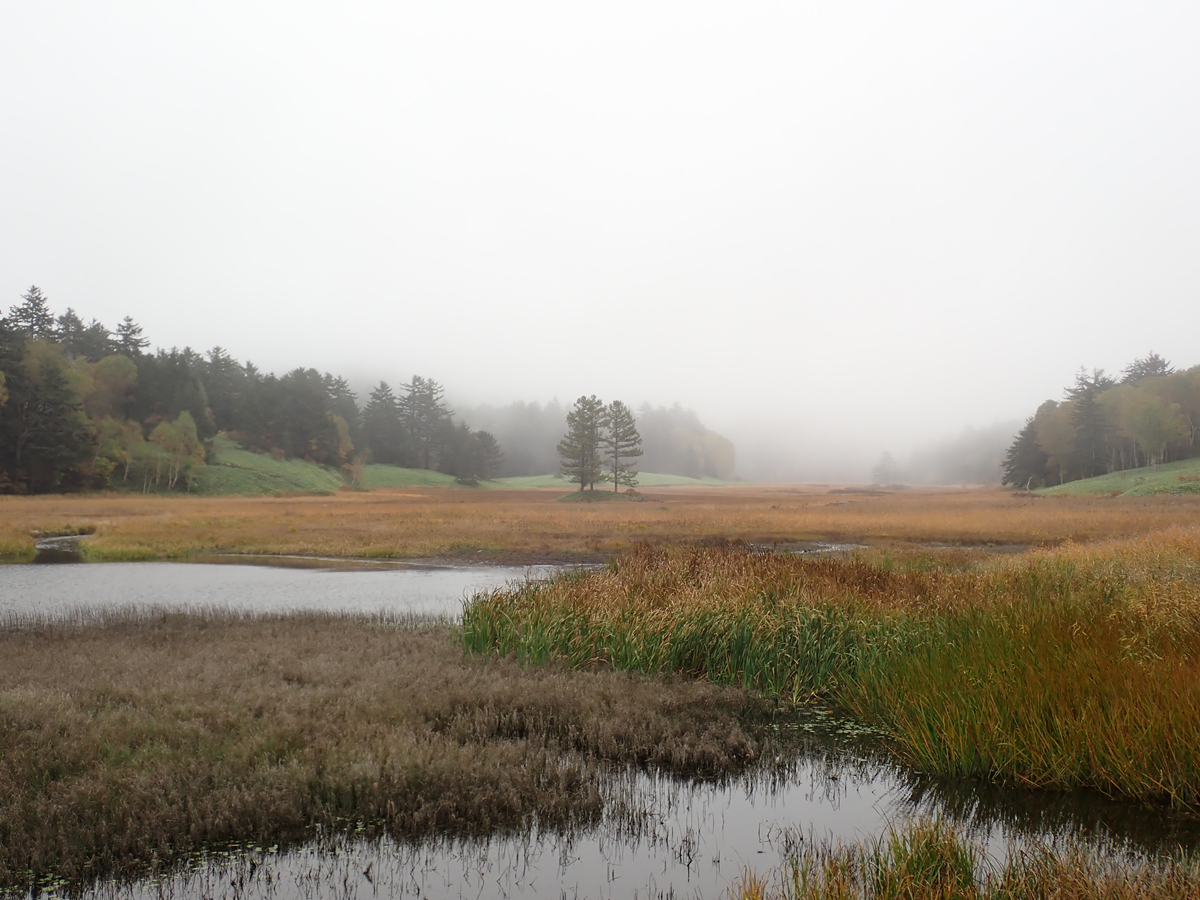 今朝は深い霧に包まれた尾瀬沼です。展望デッキから燧ヶ岳の姿は見えず、三本カラマツの奥に広がる大江湿原も白く煙っています。まるで絵の中にいるような、幻想的な風景です。