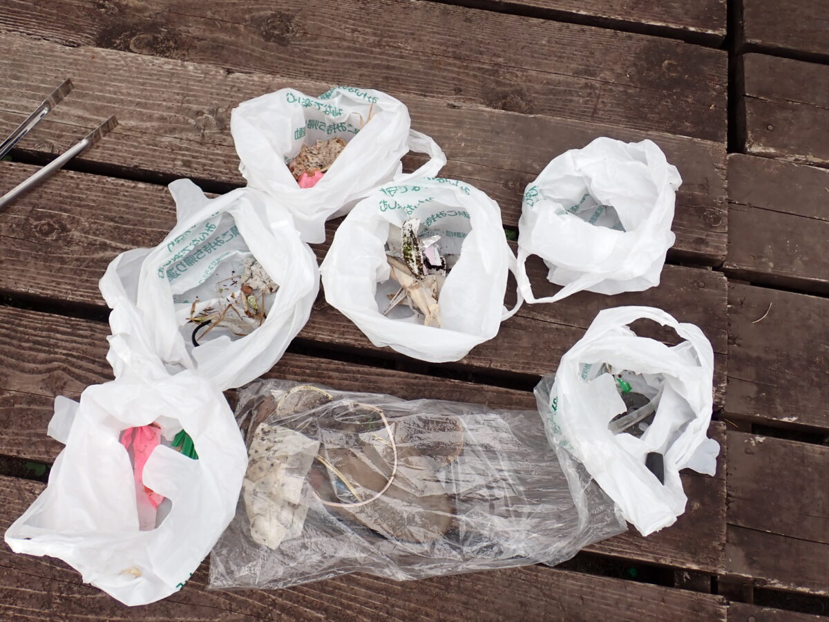落ちていたのは、飴の包み紙、ティッシュ、プラスチック製品のかけら、ストックのキャップ、ゴムなどでした。なぜか昭和時代のスリッパも!人工物はいつまでも分解されずに残るということが分かります。