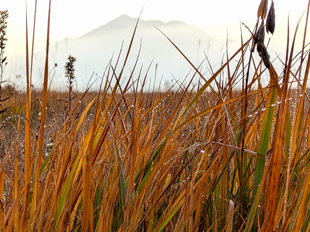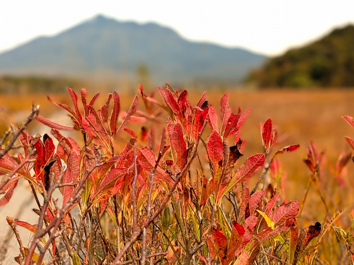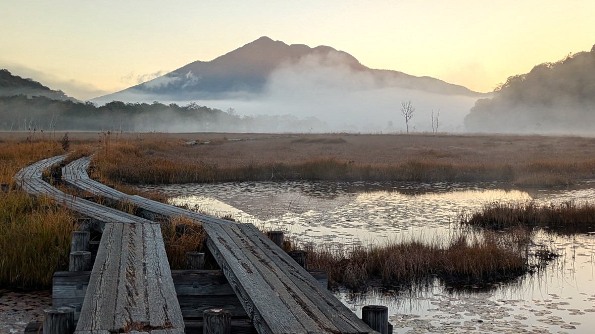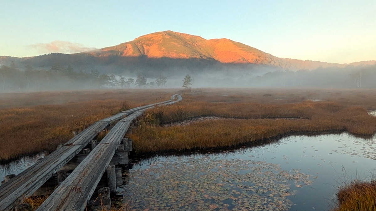 凛とした空気の中、立ち込めた靄の向こうの燧ヶ岳が茜色に染まり、これから迎える日の出を期待させます。