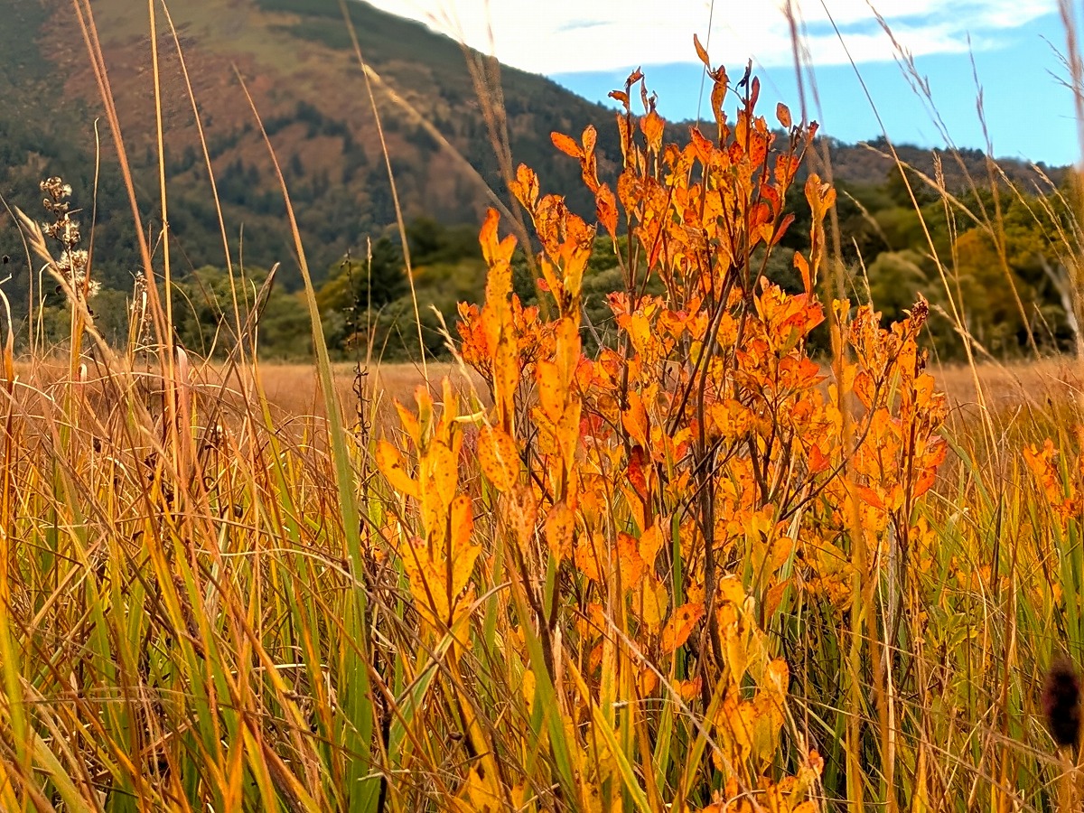 湿原は黄金色に染まり、周辺の拠水林の木々も色づいてきました。池塘のヒツジグサの葉や、湿原の中の木々も赤や黄に染まっています。湿原の秋の深まりを感じます。