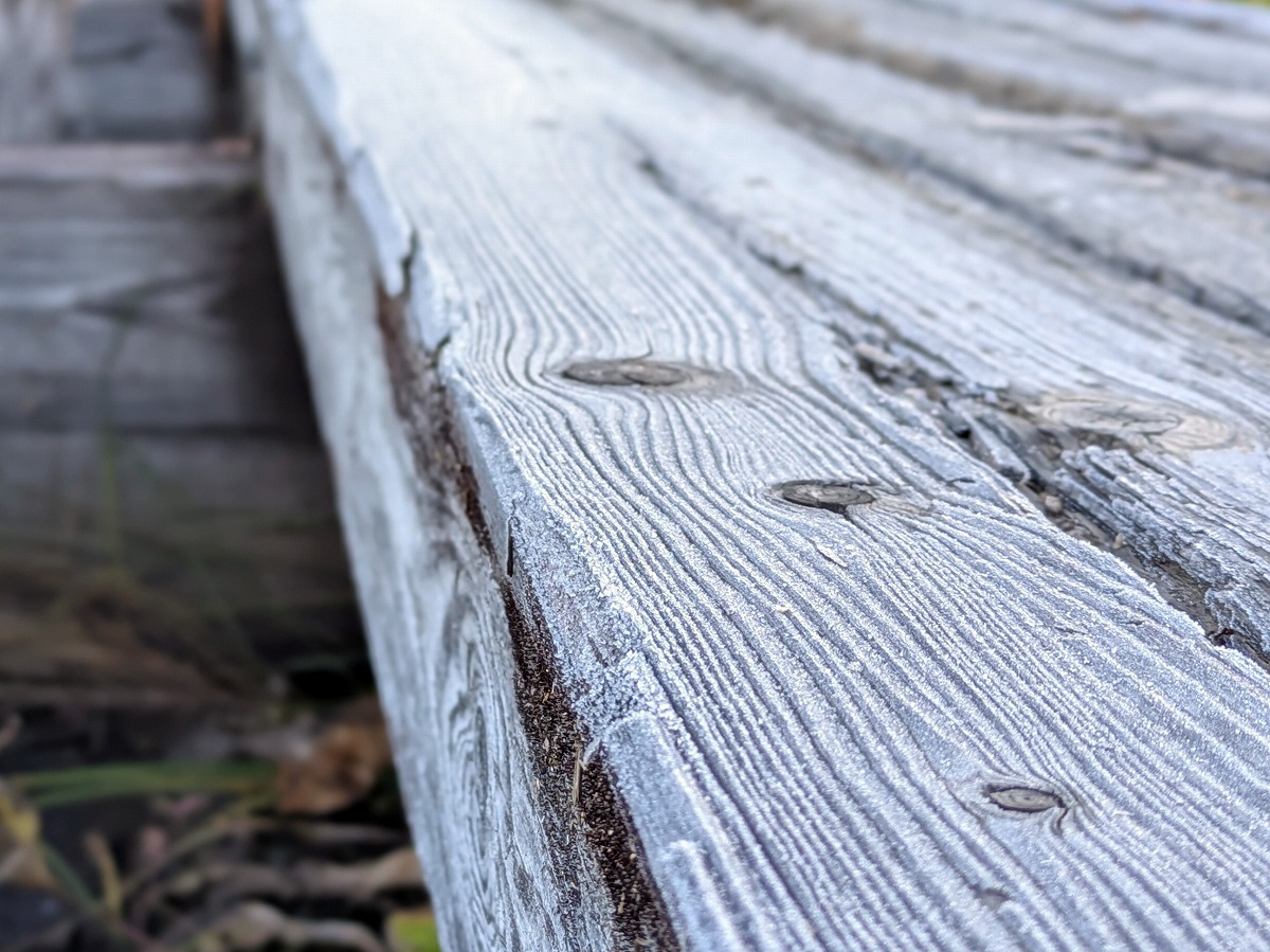 秋寒で冷え込んだ朝、木道に霜が降りていました。滑らないように、ゆっくり歩きます。