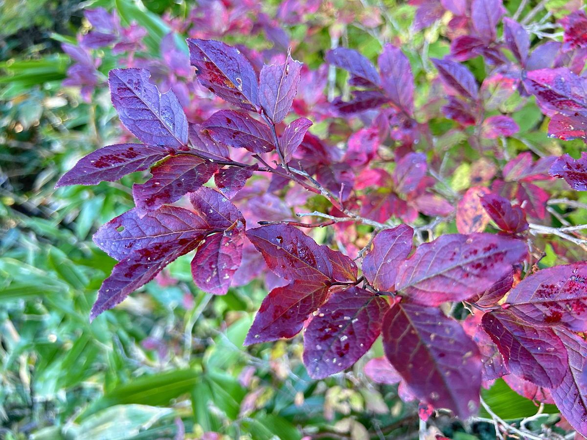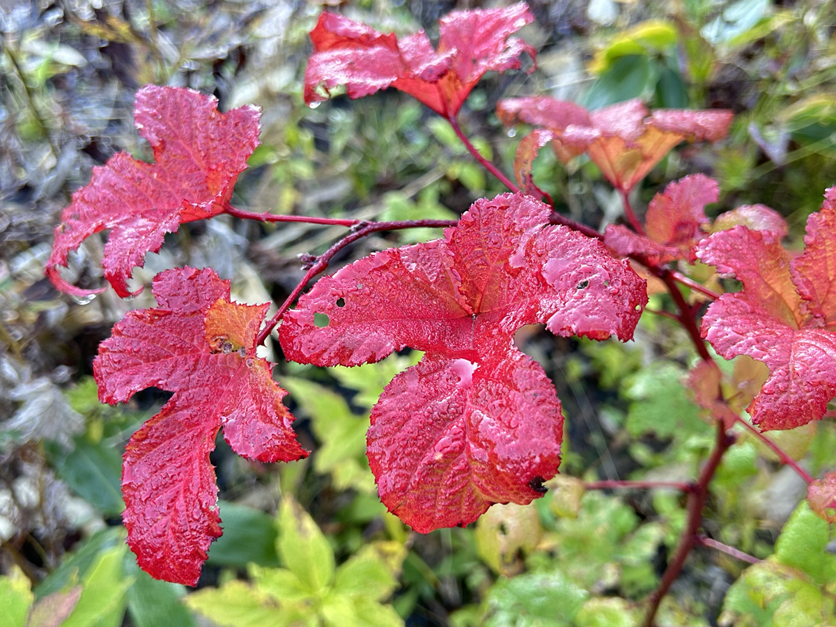 ビジターセンター付近では、クマイチゴの葉が朱赤色に色づいています。