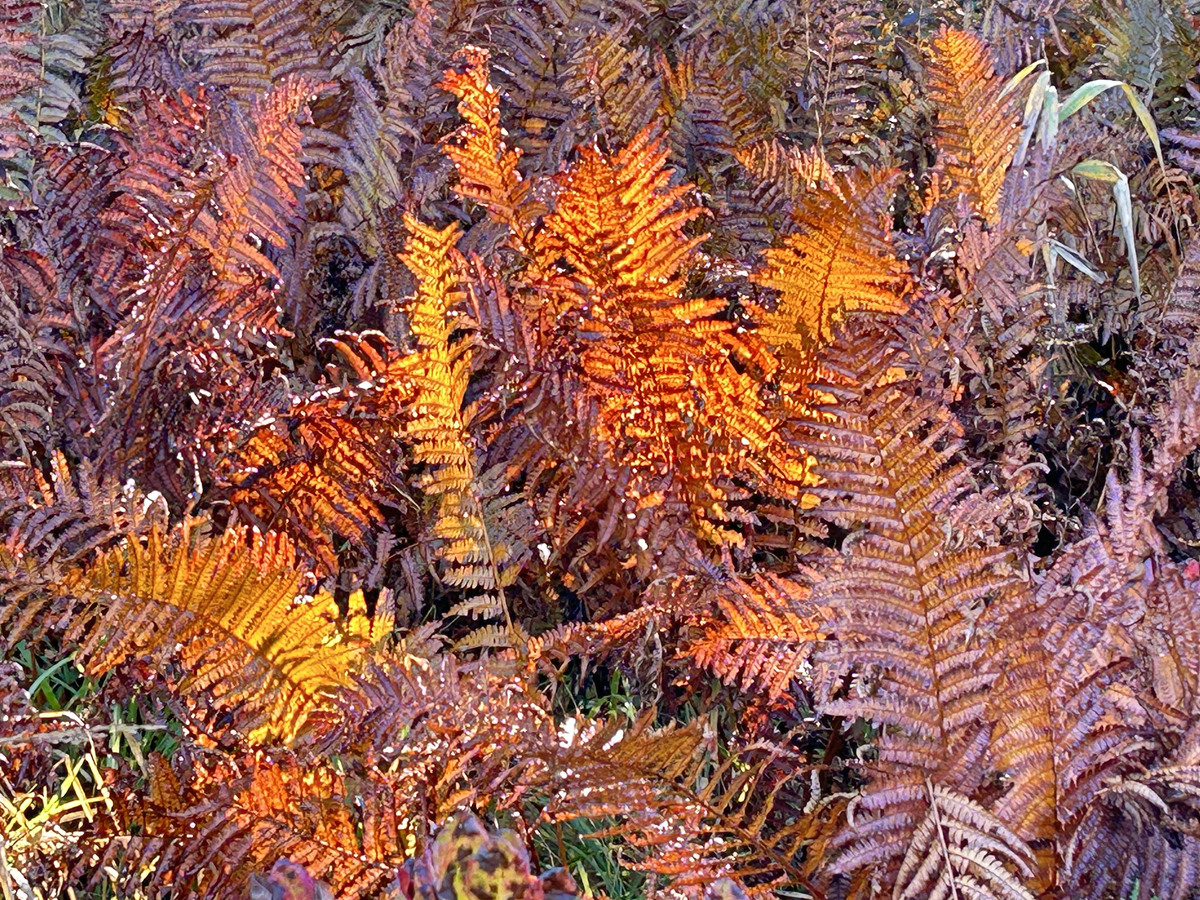 ヤマドリゼンマイの色づきが濃くなり、日陰で日射しを受けた葉がオレンジ色に透けてランプにあかりが灯ったような色合いでした。