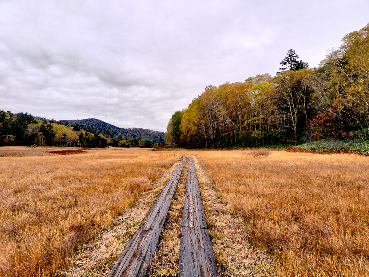 大江湿原、草紅葉の中を歩くのは、とても気持ちよいものです。周囲の木々も紅葉してきています。