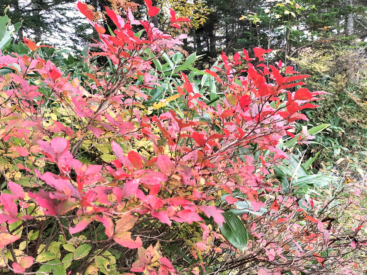 草紅葉が輝いています。奥の三本カラマツも少しずつ黄色くなってきました。