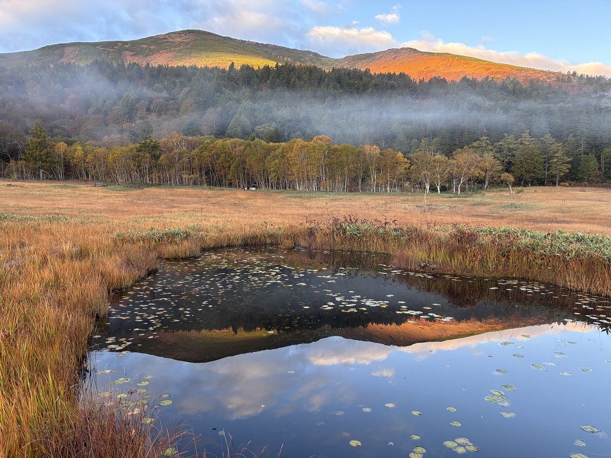 今朝、外に出たときは曇りがちだったのですが、ほどなくして光が差し、光と靄の織り成す情景に出会うことができました。尾瀬にお泊りの際は、ぜひ朝の景色もお楽しみください。