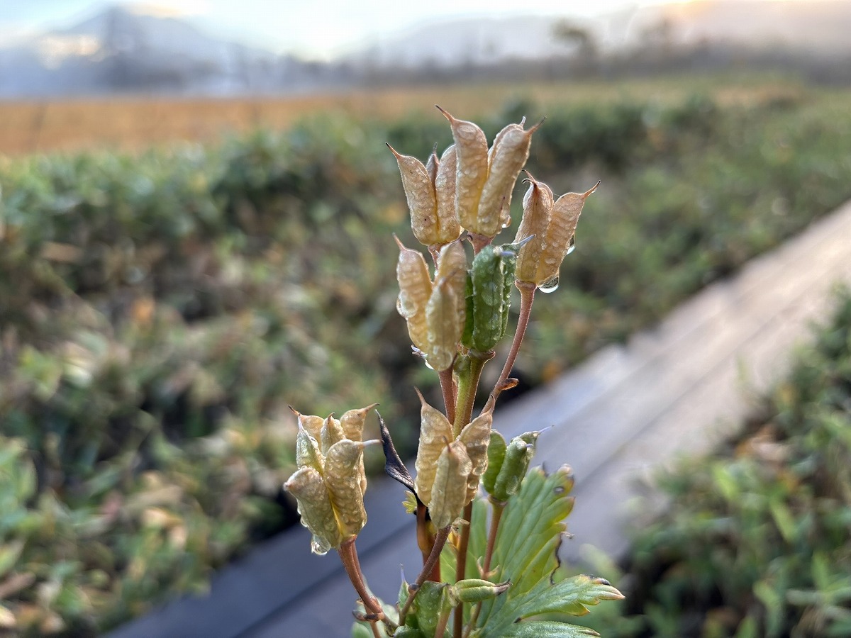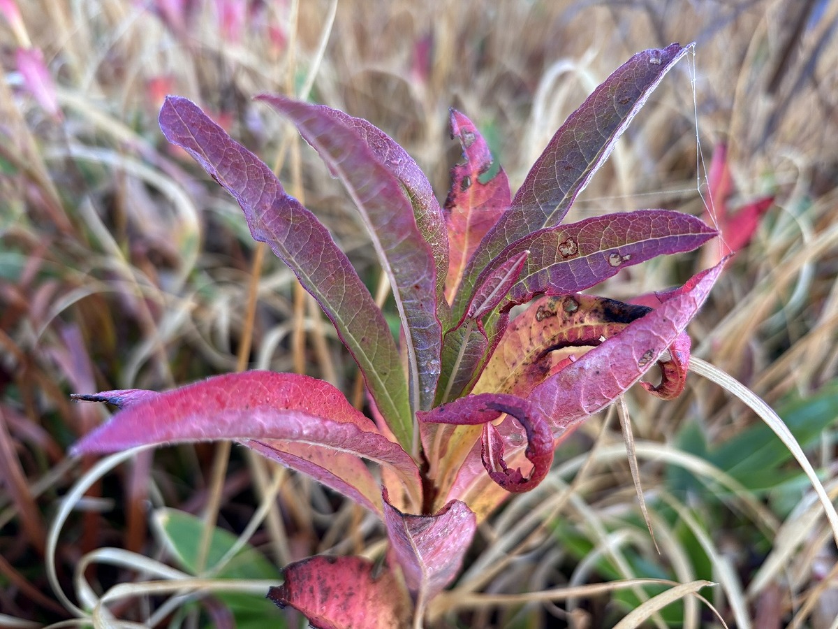 赤く色づいていたのはレンゲツツジの葉です。緑がかった赤や鮮やかな赤など、いろいろな赤があり、自然が作り出す美しさを感じます。オクトリカブトの実は水滴をまとい、早朝ならではの姿を見ることができました。