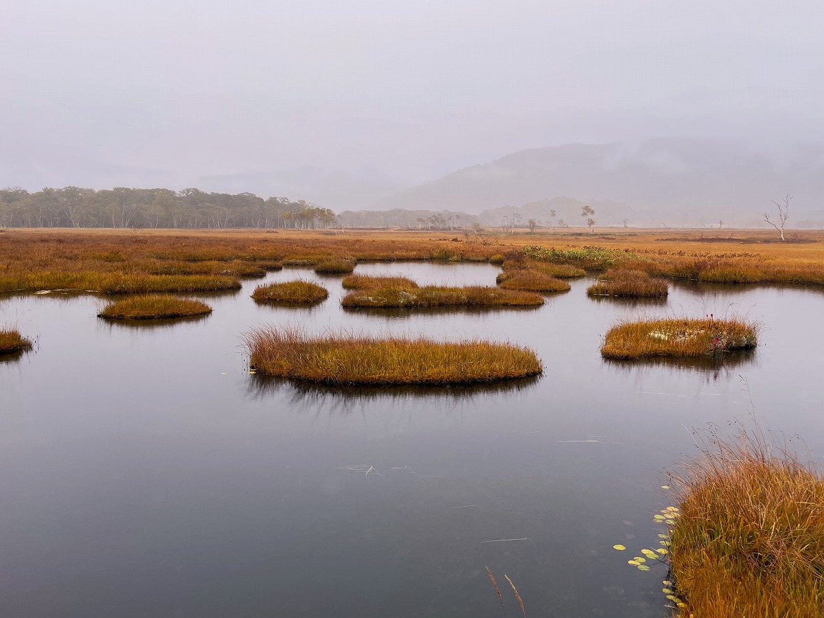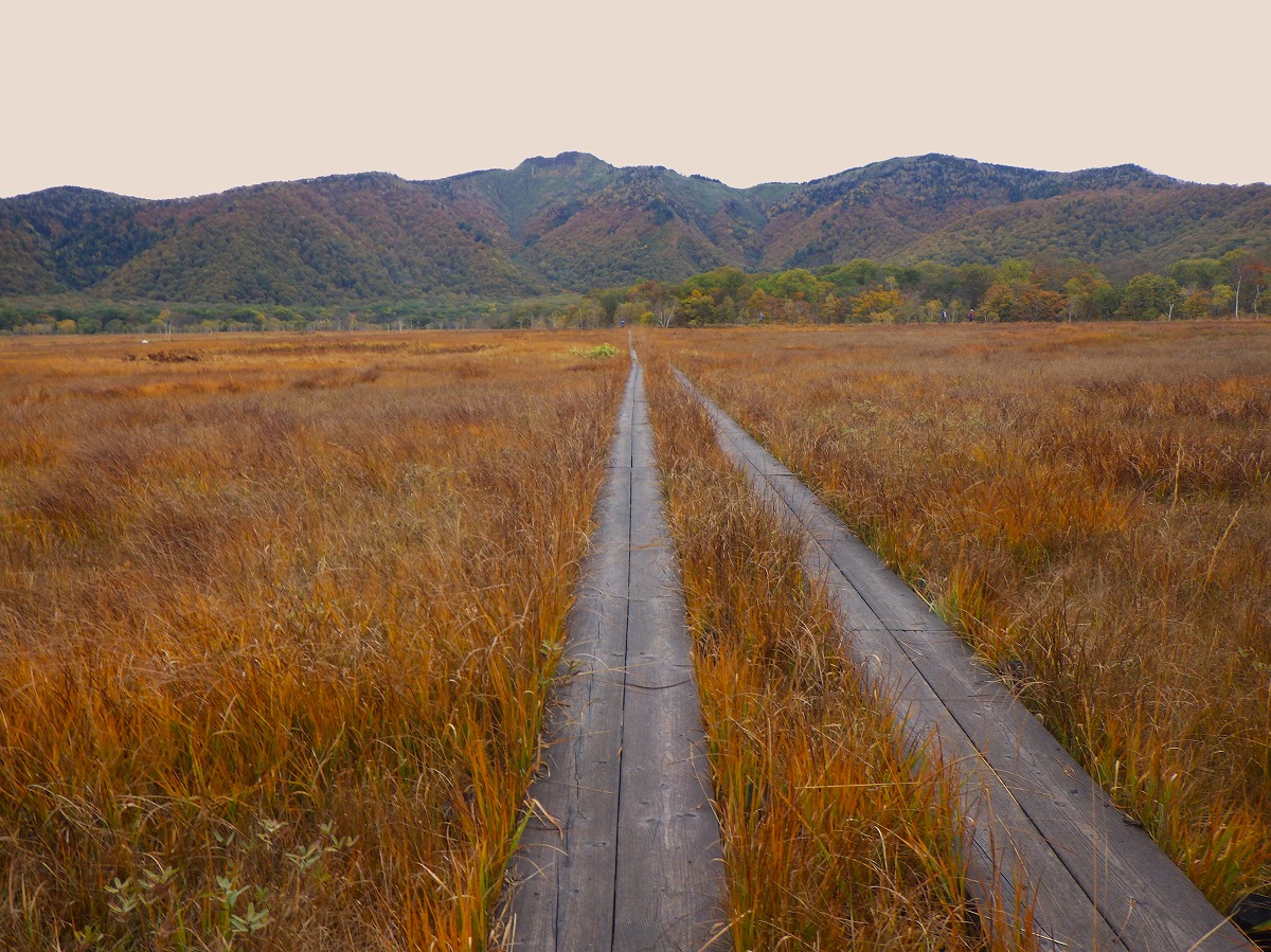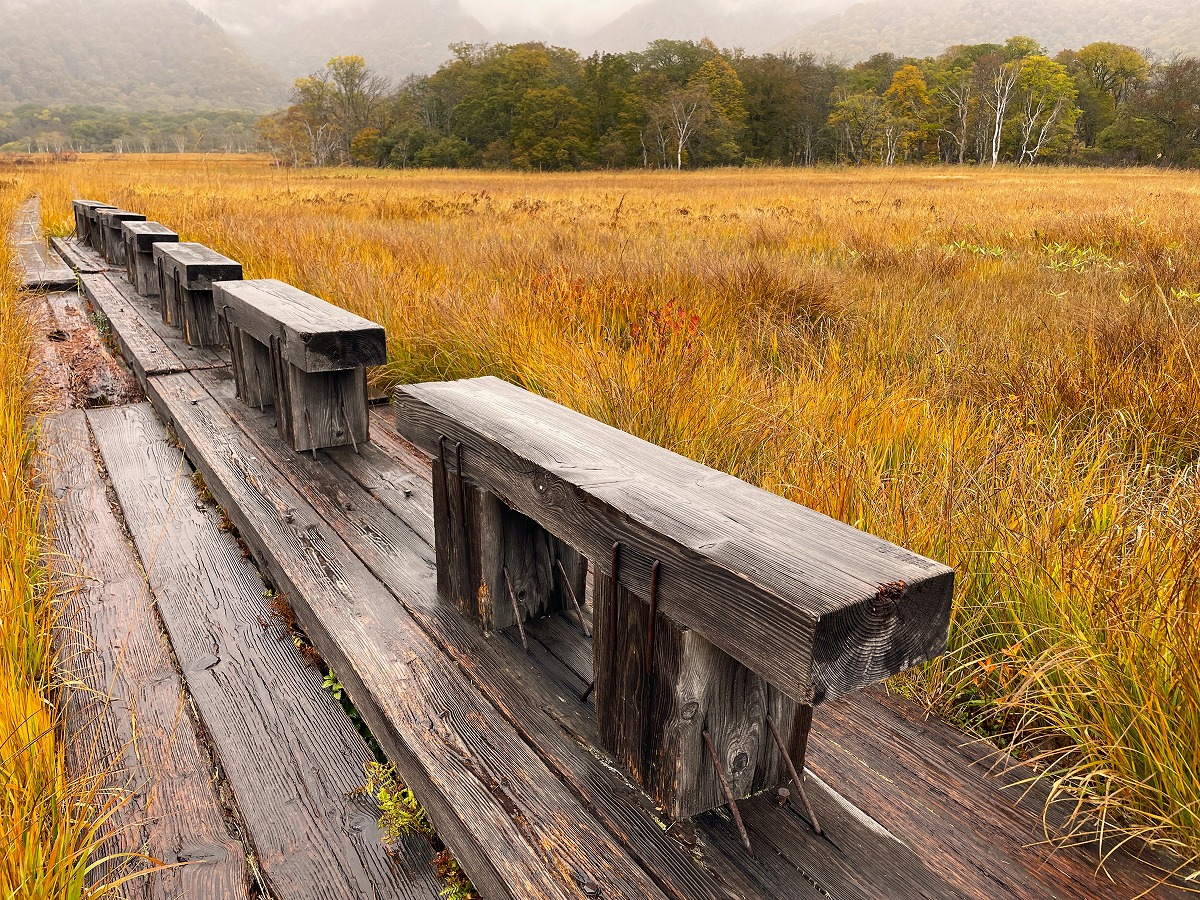尾瀬ヶ原をイメージすると、写真のようなまっすぐ続く木道と広大な湿原を思い描くのではないでしょうか。天気予報がくもりや雨の日でも、尾瀬ヶ原では見渡す限り黄金色に染まる草もみじの様子を楽しむことができますので、ぜひ足をお運びください。