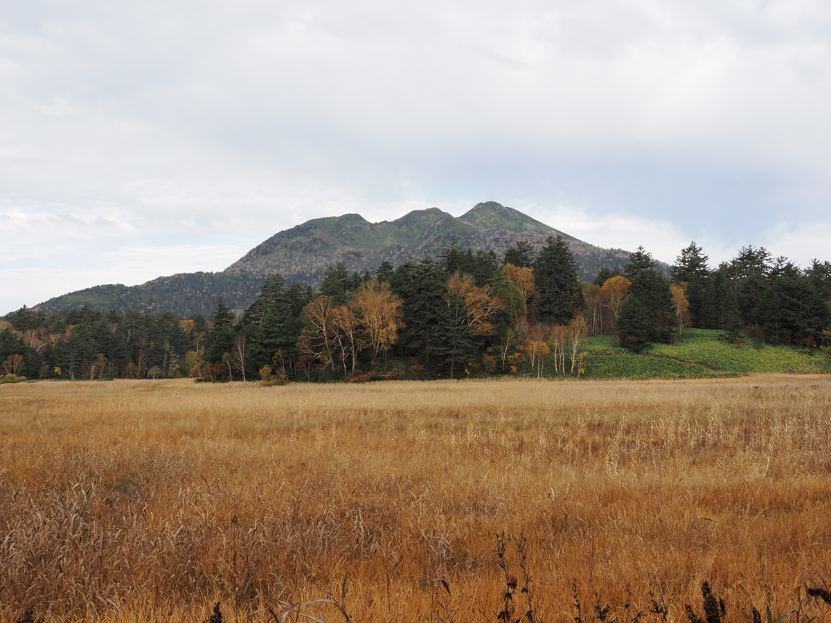ビジターセンターから大江湿原に出てすぐの場所での風景です。燧ヶ岳全体がくっきり見え、その手前で森や湿原が秋景色を盛り立ててくれています。