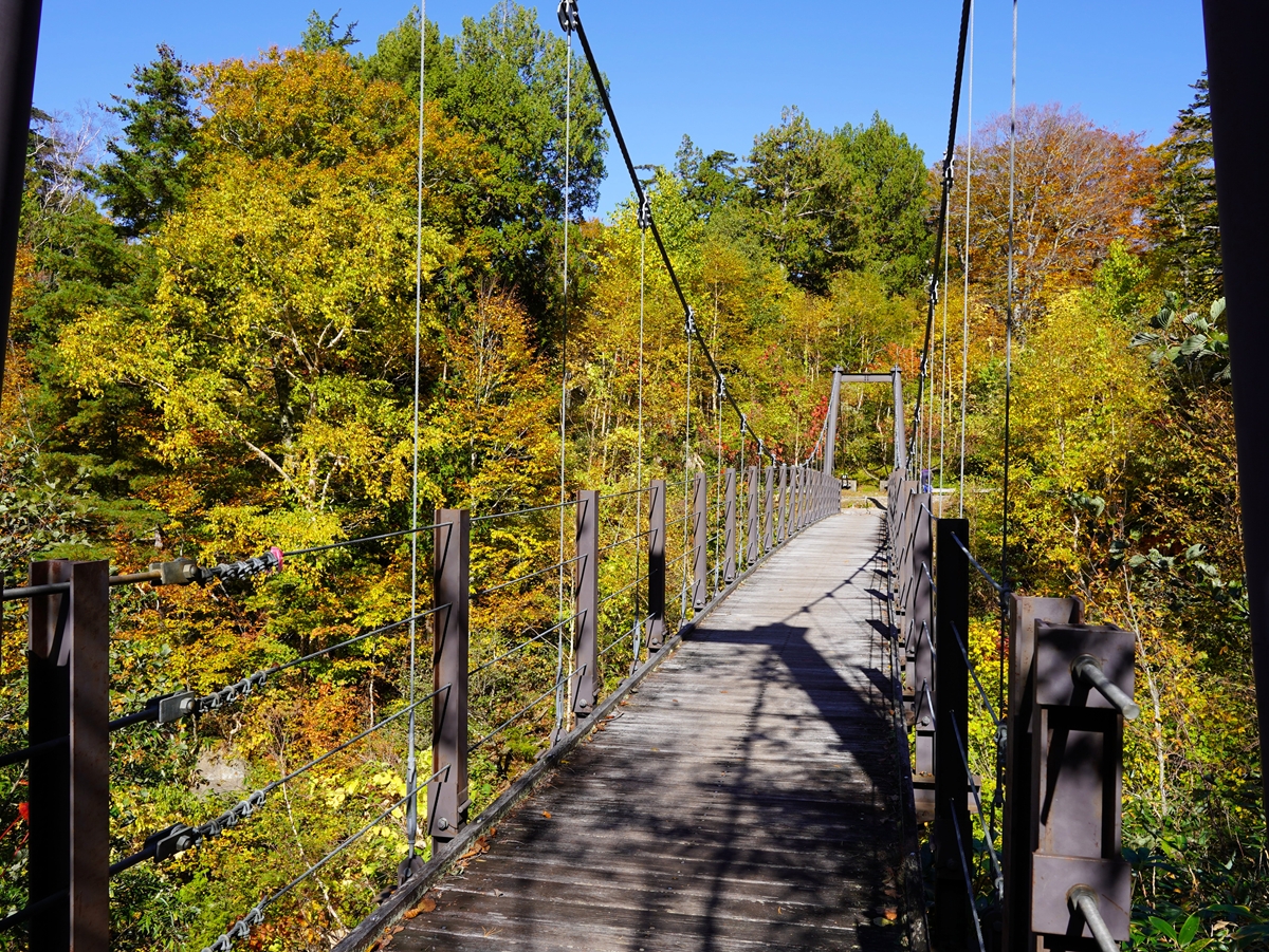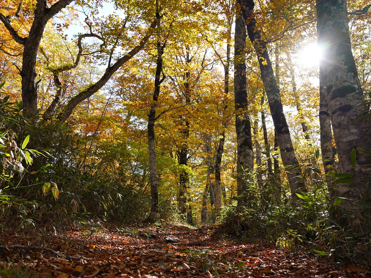 特に燧ヶ岳裾野の標高1400~1500m付近では、ブナやカエデ類の広葉樹も多く、鮮やかな葉っぱに囲まれてシャカシャカと落ち葉をかき分けながら森林浴を楽しむことができます。