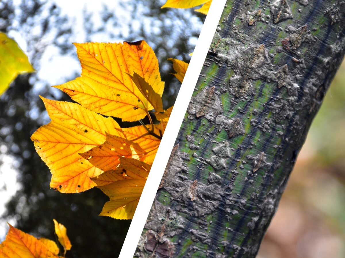 左:ウリハダカエデの葉/右:ウリハダカエデの樹皮