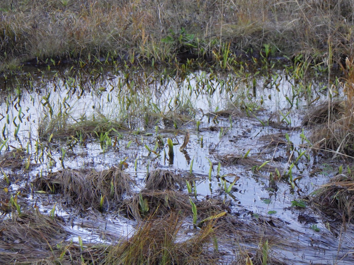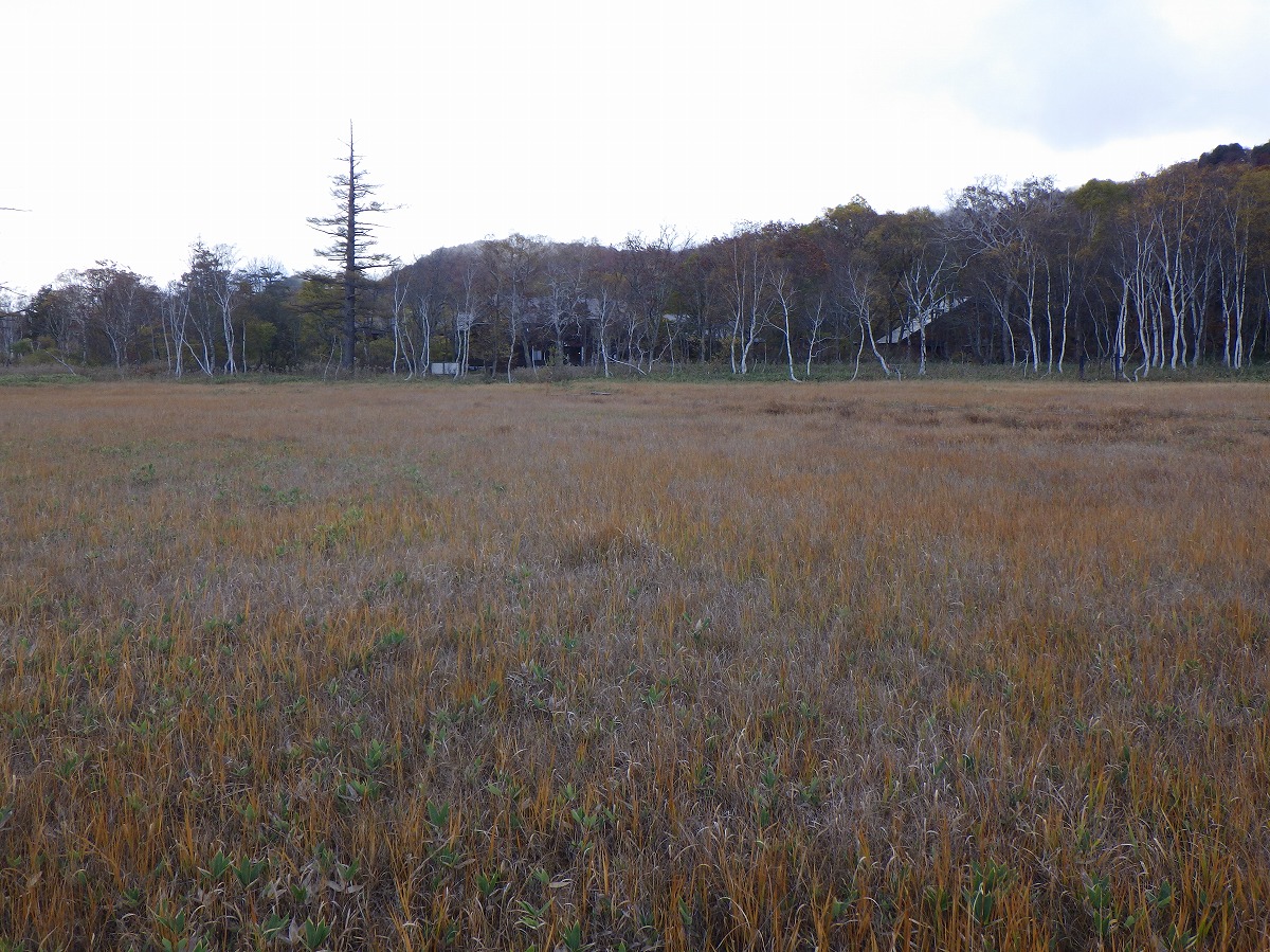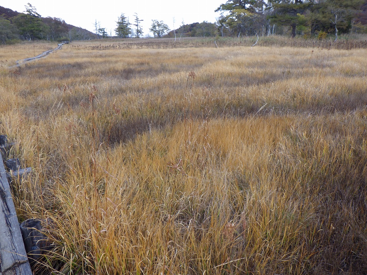 この時期になると湿原の凹凸(ケルミシュレンケ)がわかりやすくなります。尾瀬ヶ原では落葉が進みカラマツが黄葉しています。