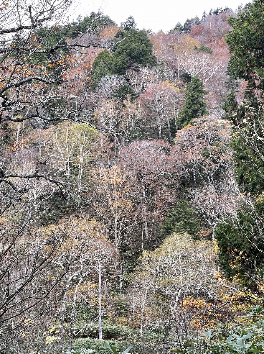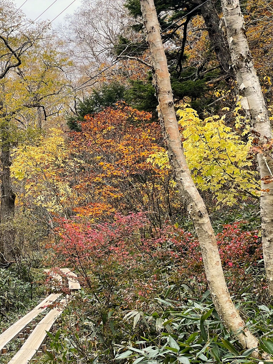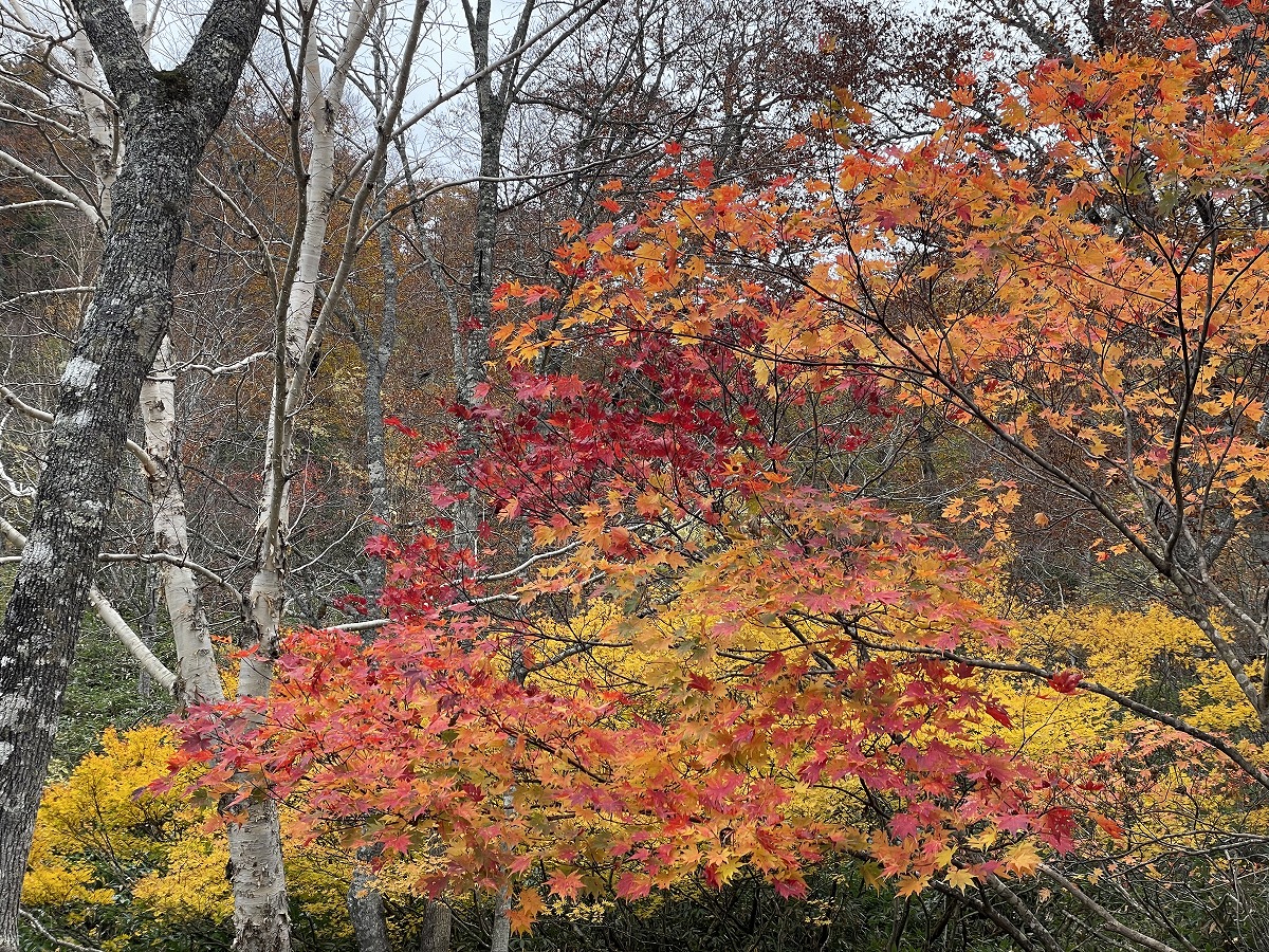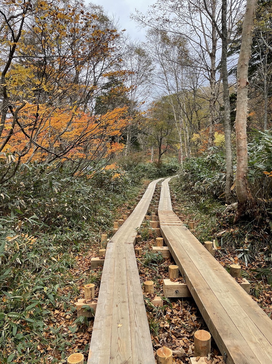 木道脇では、コマユミの赤色やコシアブラの薄黄緑色、カエデ類の山吹色などの紅葉が見られます。