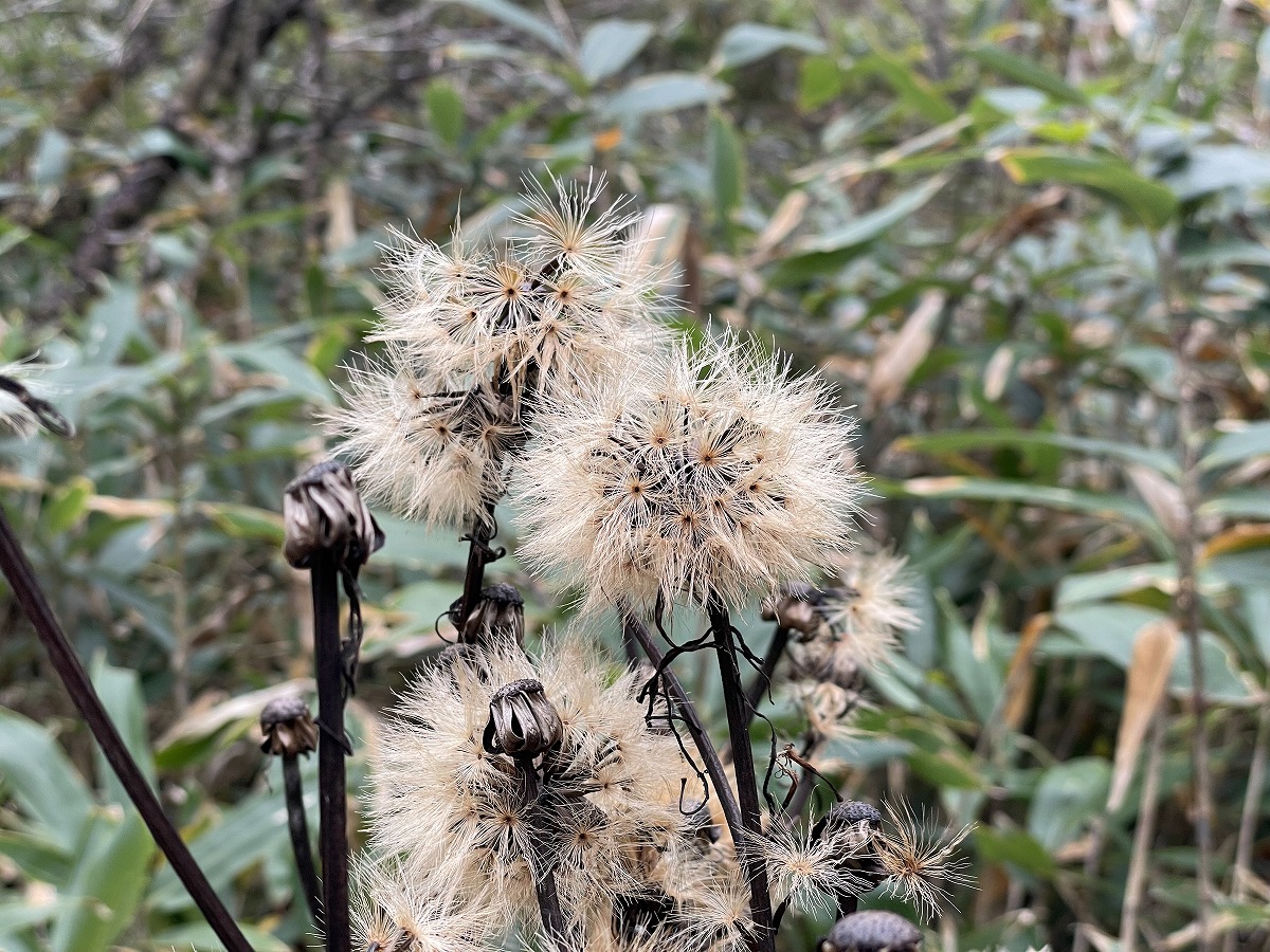 夏に小さいヒマワリのような黄色の花を咲かせていたマルバダケブキの種子が、ベージュ色の毛糸のポンポンのようです。直径5cmくらいあるので目立ちます。