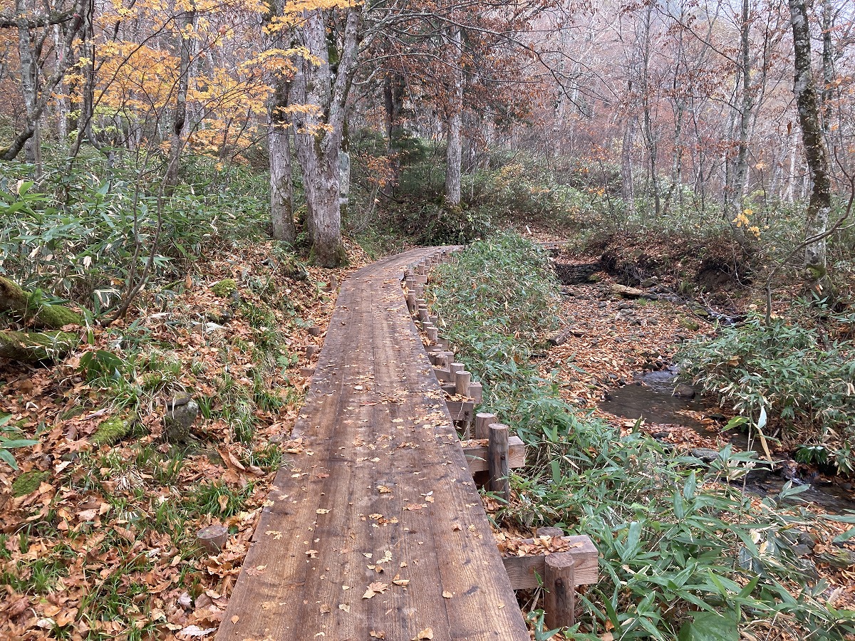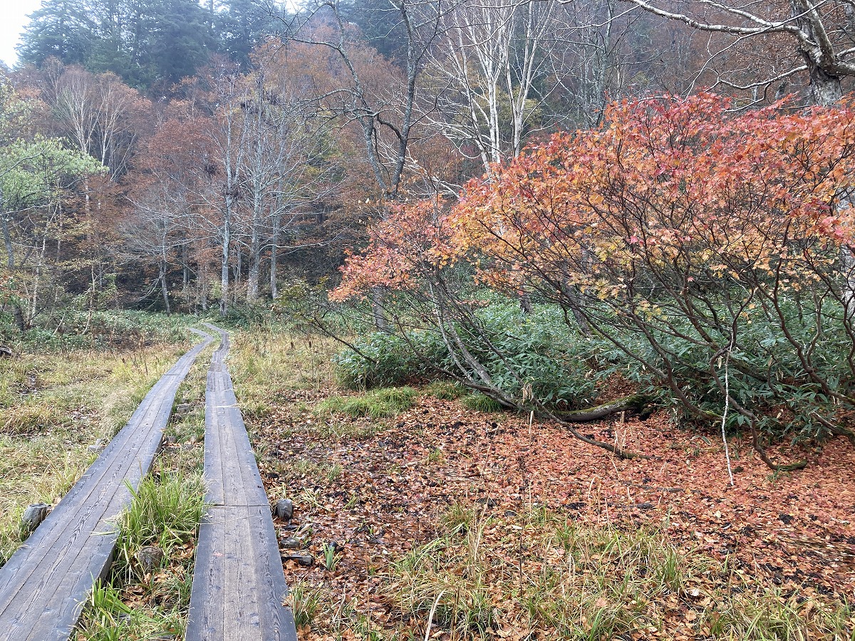 鳩待峠から山ノ鼻に向かう途中のテンマ沢湿原付近です。湿原や木道に落ちた葉も風情があり、秋が深まっていくのを感じます。ゆっくりと眺めていると時間が経つのを忘れてしまいそうです。