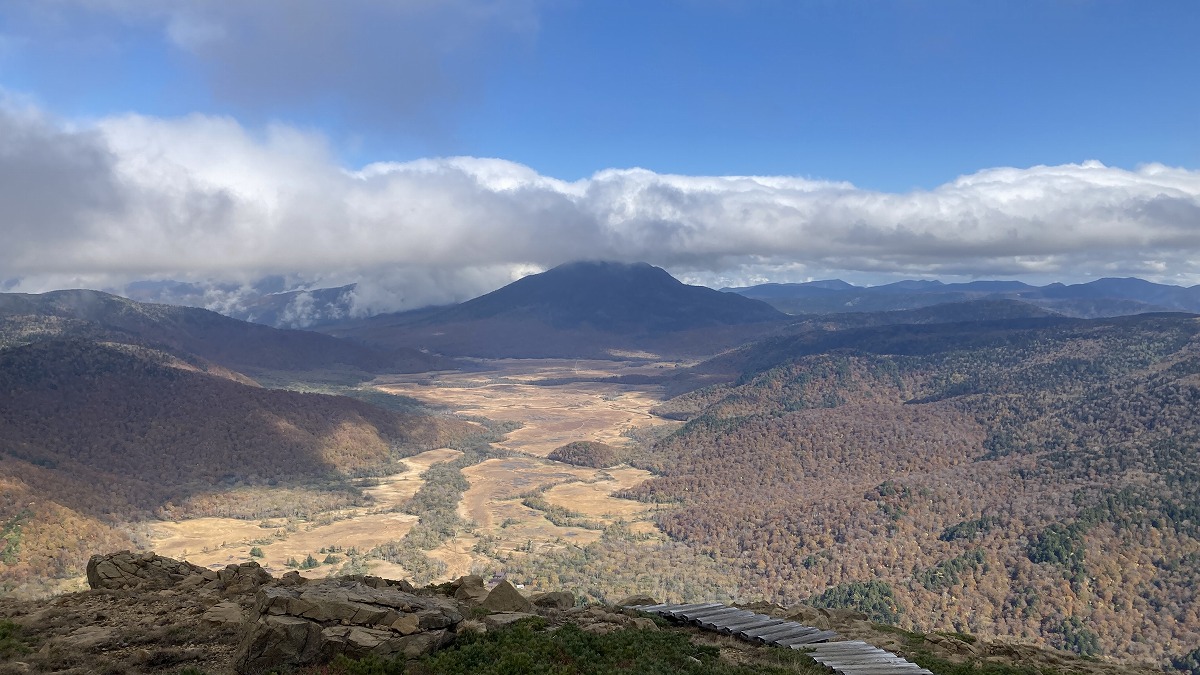 東面登山道からは尾瀬ヶ原の黄金色に色づく湿原を一望することができます。草紅葉と木々の紅葉がとてもきれいに見えます。