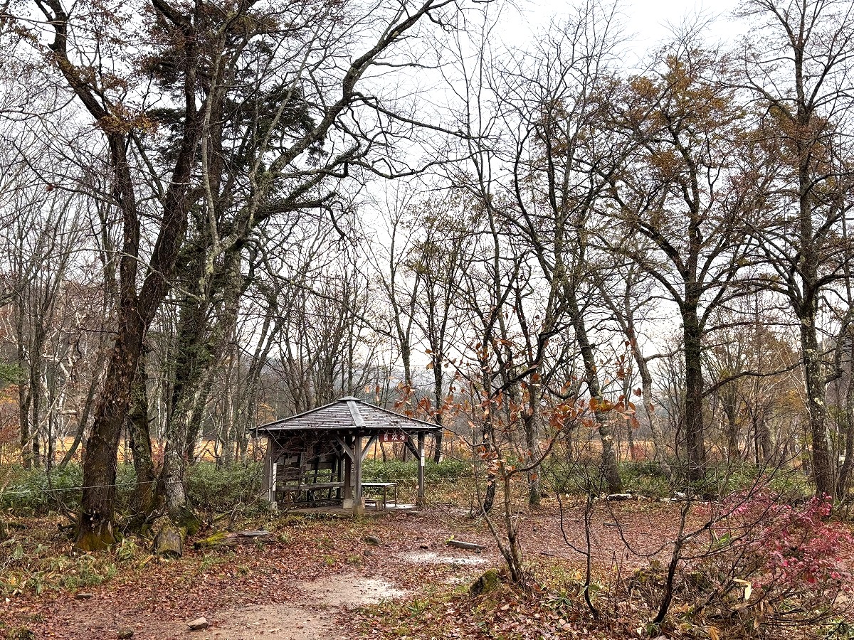 キャンプ場には落ち葉がいっぱいです。幹の間から研究見本園の湿原がよく見えます。