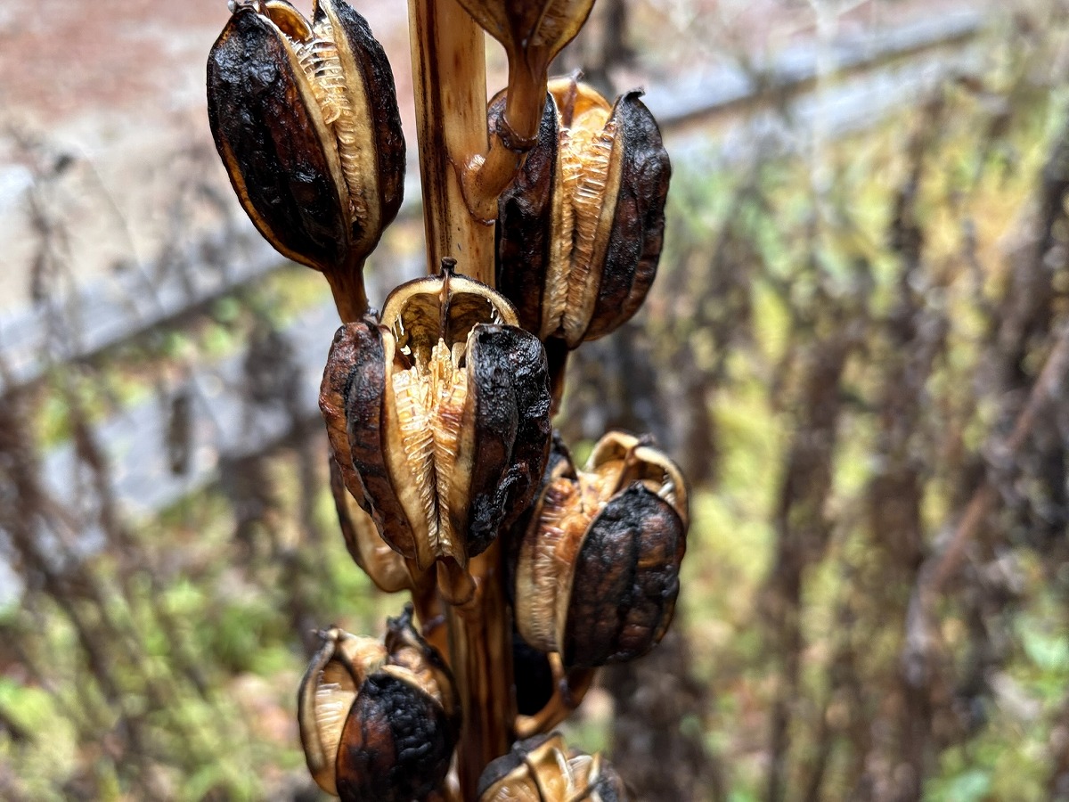 はじけた実の中に種がぎっしり入っていました。大きさ1cmほどの種で、風にのって運ばれるタイプのようです。こんなにたくさんの種ができても、発芽して大きく生長するのはほんの一握りですが、そのようにして命がつながれ、尾瀬の自然が成り立っているのですね。