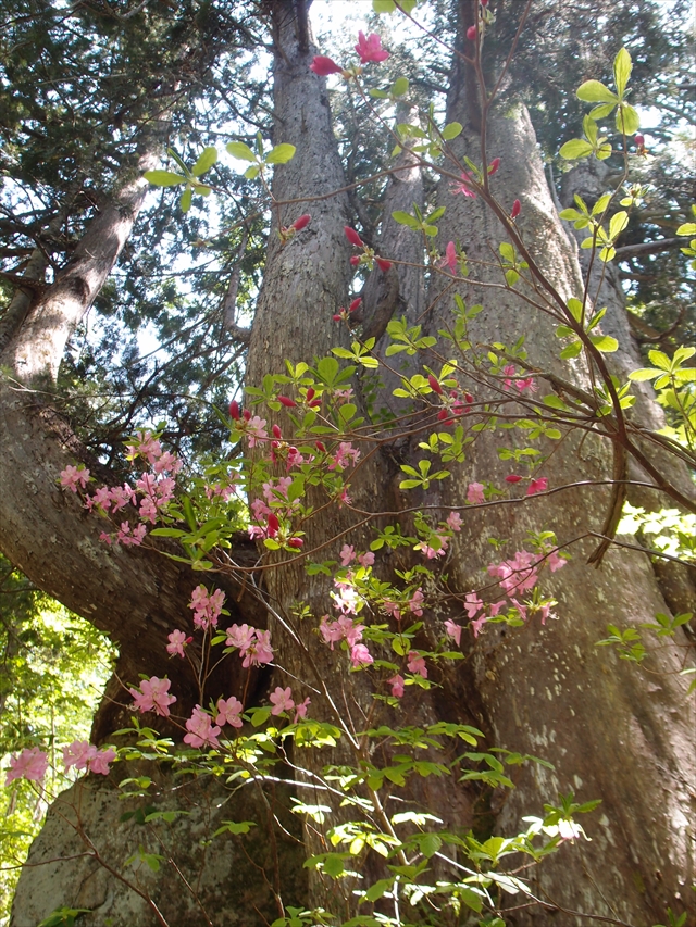 こちらはネズコの木とその根元で育つムラサキヤシオツツジ。