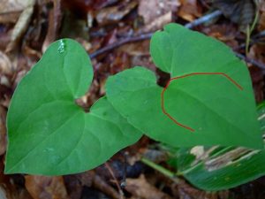 ハート形の葉で(赤く線を引きましたが)葉脈が「逆さU」になる葉を見つけたら