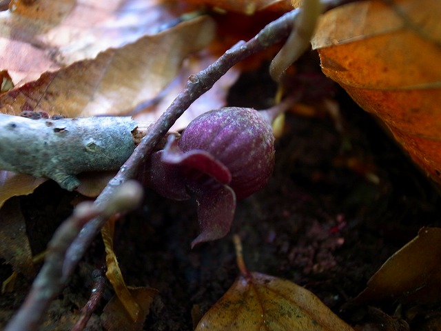 ウスバサイシンの花が落ち葉の中から見えます。