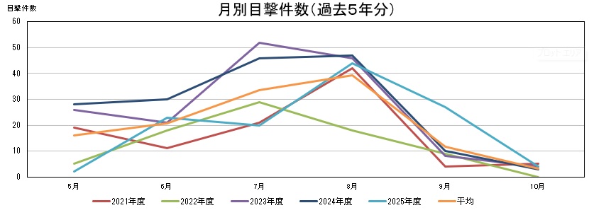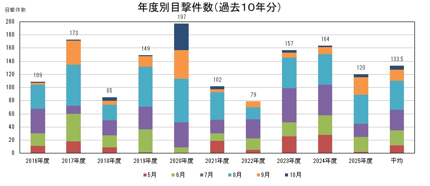 クマの目撃件数は、年によって差がありますが、例年、特に6月・8月の目撃件数が多くなっています。
